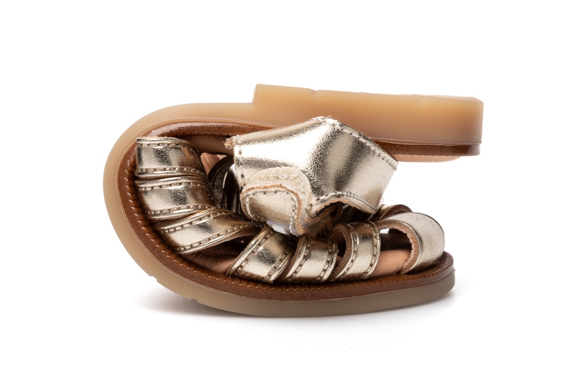 Золотистые босоножки из натуральной кожи с актуальным дизайном в стиле «сандалий рыбака».